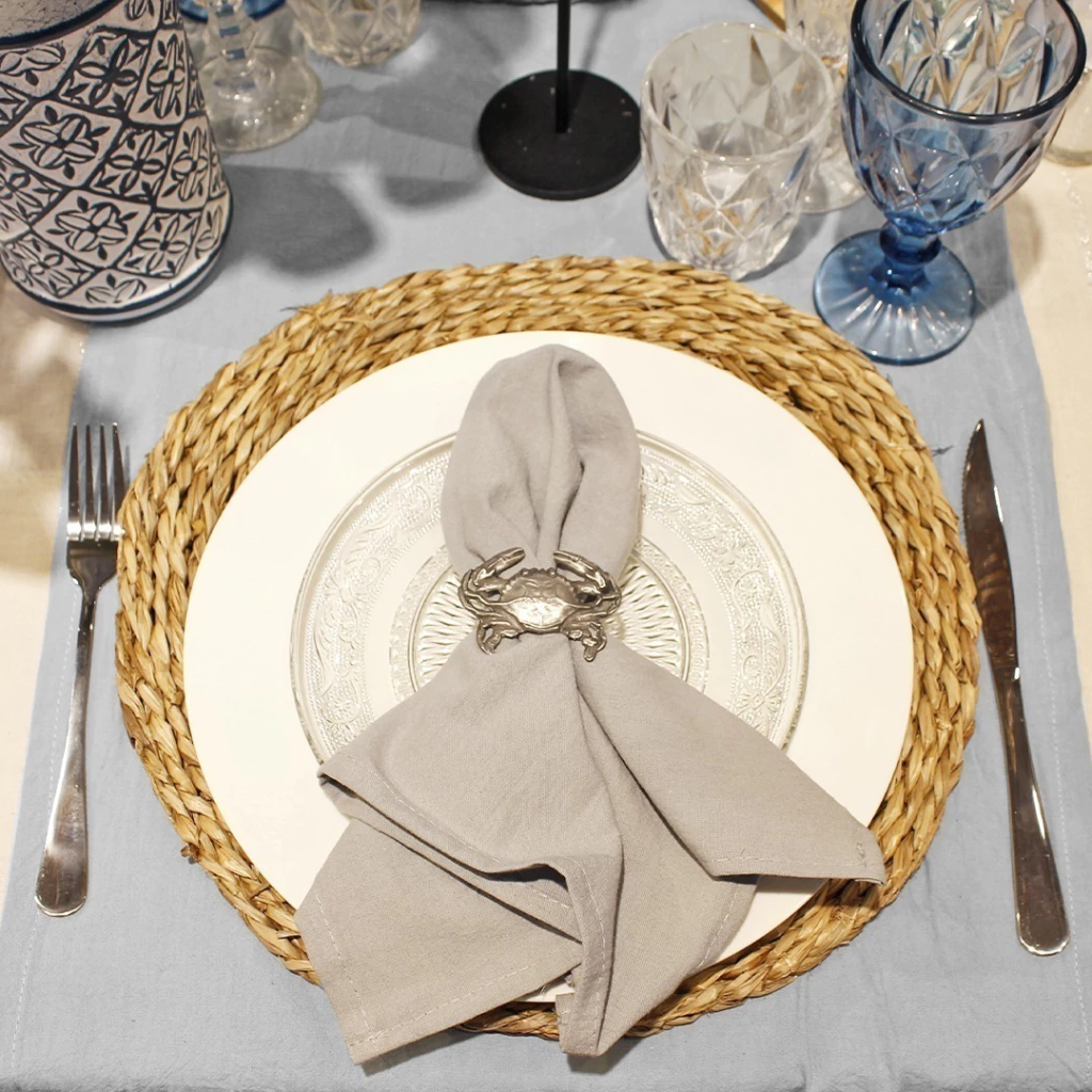 ✔ Servilletas en tonos grises, sujetas con anillos en forma de cangrejo plateado, un guiño al estilo náutico.