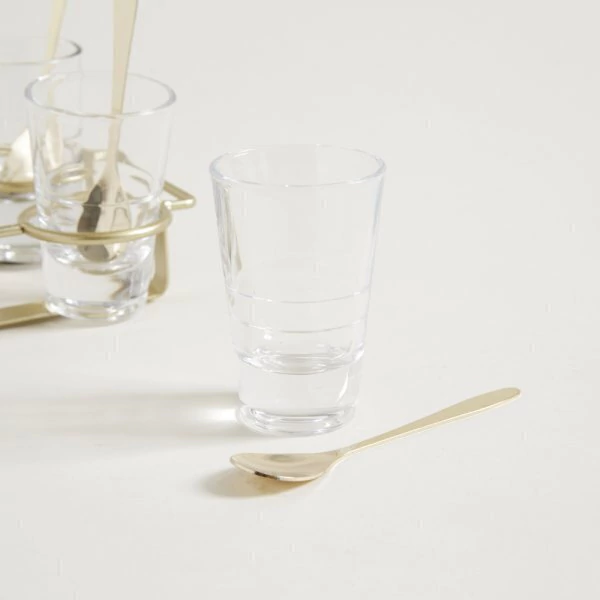 Set X6 copetineros de vidrio ordenados en rack de metal. Incluye cucharita de acero.