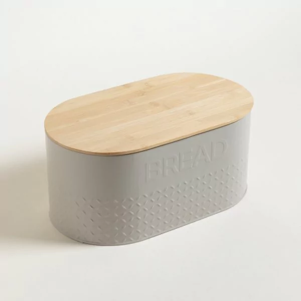 Lata oval de acero galvanizado color gris con tapa de bamboo.